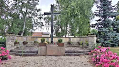 Halbrunde Mauer, in die Gedenktafeln eingefügt sind. Vorne ein Kreuz auf einem Sockel.