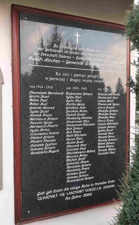 Stein-Gedenktafel für die Gefallenen des 1. und 2. Weltkriegs an der Außenwand der Kapelle mitten im Ort.