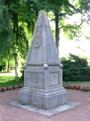 Vor der Kirche ein Obelisk zum Gedenken der Opfer der Weltkriege.