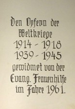 In der Kirche das Gedenkbuch mit 28 und 81 Namen der Kriegstoten beider Weltkriege. Es wurde im Winter 1960/61 geschrieben von Ursula Helbig, Salzdahlum.