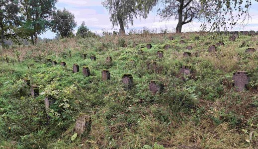 Der Friedhof war 2025 stark zugewachsen und die Steine mit Moos bedeckt.