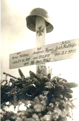 Foto von Kriegsgrab mit hölzernem Kreuz und Stahlhelm.