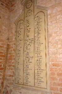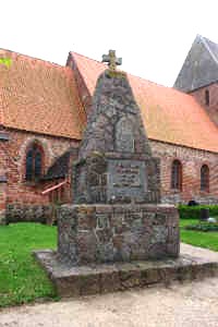 Neben der Kirche: Pyramide aus Feldsteinen auf zwei Stufen, oben ein Kreuz. An der Pyramide eine Tafel, auf der obersten Stufe eine Inschrifttafel.