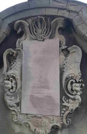 Das Denkmal ist in die Kirchhofmauer eingelassen. Es ist mit einer Wappenzierde umgeben
