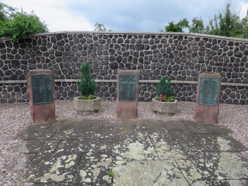 Drei einzeln stehende Gedenksteine in einer kleinen Anlage.