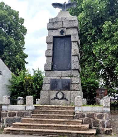 Denkmal mit krönendem Adler, unmittelbar vor dem Friedhof in Schönfeld.
