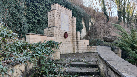 Steindenkmal an der Straße kurz vor Schraplau. Denkmal und Namenstafel wurden 2021 restauriert.