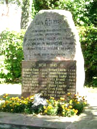 An der Kirche Ehrenmal für die Kriegstoten beider Weltkriege. Aufrechter Findling mit der Inschrift.