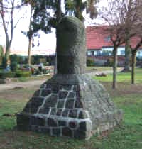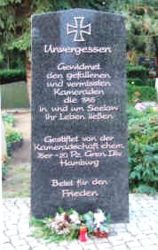 Im Eingangsbereich ein Stein mit Eisernem Kreuz und Inschrift der Kameradschaft ehem. 76er - 20. Pz.Gren.Div. Hamburg.