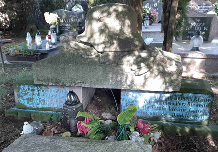 Zwei Steine mit einem Sinnspruch und darauf ein Deckstein mit Stahlhelm-Plastik auf einem Lorbeerzweig.