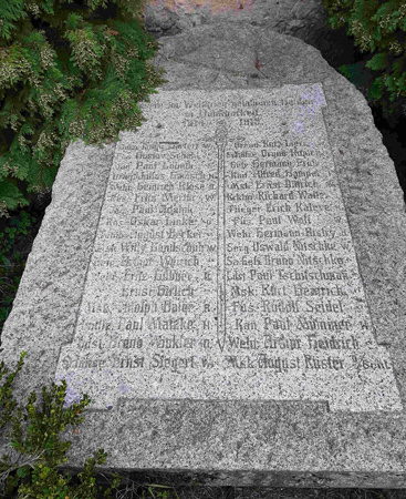 Denkmal für die Gefallenen des 1. Weltkriegs. Granitplatte mit Relief eines Stahlhelms im Oberteil.