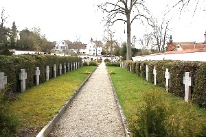 Im Friedhof mehrere Doppelreihen von Steinkreuzen.