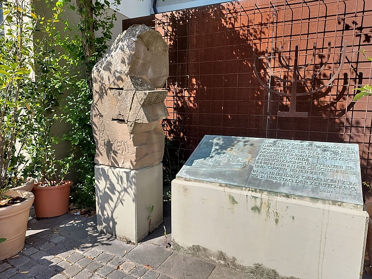 In der Kleinen Grabengasse ist ein kleiner Bereich des Parkplatzes durch Bänke und Blumenkübel abgetrennt. Am Ende dieses Bereichs erinnert eine rostrote Stahlwand mit aufgesetztem Gitter und siebenarmigem Leuchter an die zerstörte Synagoge. Davor liegt ein niedriges Pult mit der Informationstafel.