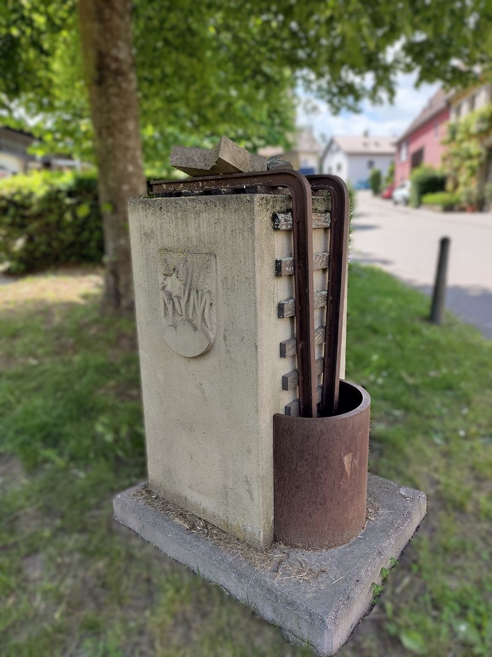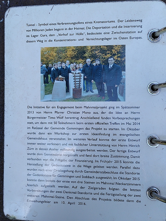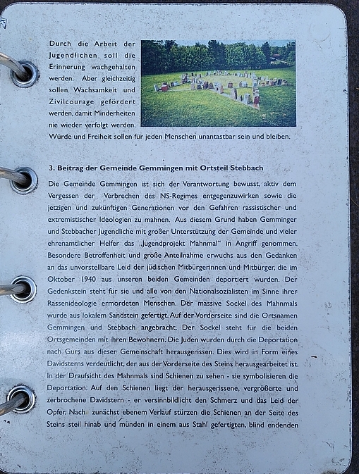 In der Schulstraße von Stebbach, vor dem Dorfplatz, steht das beeindruckende Denkmal. Es wurde für die am 20. Oktober 1940 nach Gurs deportierten Jüdinnen und Juden aus Gemmingen und Steppach errichtet. An der Vorderseite ist die Inschrift zu sehen und ein herausgemeißelter Davidstern. An der Seite das Stebbacher Wappen ebenfalls mit herausgemeißeltem Davidstern, die die fehlenden jüdischen Mitbürgerinnen und Mitbürger symbolisieren. Auf der Oberseite und der Rückseite führen Schienen entlang. Darauf liegt ein zerbrochener Davidstern. Die Schienen stehen für die Deportation. Sie enden im Dunkel eines stählernen Tunnels, das für das schreckliche Ende der deportierten Stebbacher Jüdinnen und Juden in den Vernichtungslagern steht.