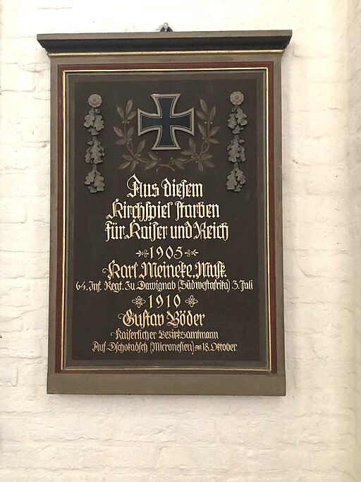 In der Kirche St. Marien sechs Namenstafeln für 1813-15, 1864 und 1866, 1870/71, Kolonialgefallene und Ersten Weltkrieg.