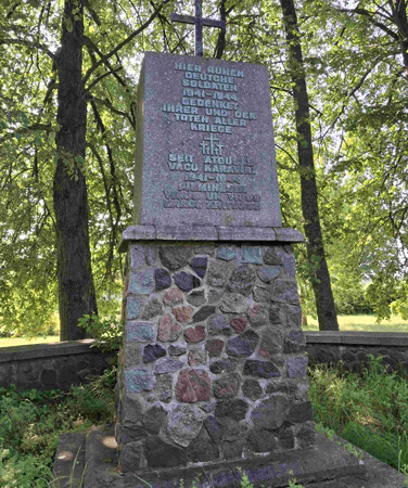 nordöstlich von Olaine. Kleine rechteckige Anlage mit einer breiten Natursteinmauer und einem Denkmal.