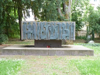 Vor einem modernen Block mit Inschriften aus dem Jahre 1963 liegen auf beiden Seiten sieben auf dem Boden befestigte Metalltafeln aus dem im Zweiten Weltkrieg zerstörten Kriegerdenkmal von 1870/71, das im Jahr 1874 errichtet worden war.