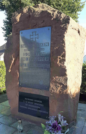 Denkmal für die Opfer des 1. und 2. Weltkriegs gegenüber der Kirche. Großer roter Felsblock mit Widmungstafel (ohne Namen).
