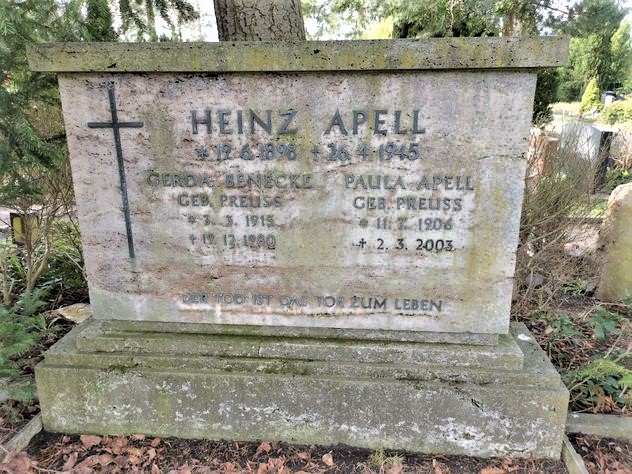 Uhrmacher und Juwelier, Schuß durch Feindeinwirkung; Kriegsgräberstätte Berlin-Temp., Röblingstr., Block 30 Reihe 3; Ehemann von Paula Apell, geb. Preuss (1906-2003); Vorname: Heinrich |