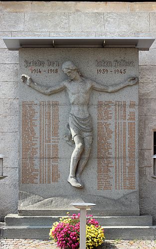 Gedenkwand mit einer Christus-Figur in der Mitte.