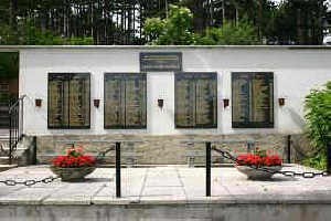 Im Friedhof, neben der Einsegnungskapelle: Mauer mit Gedenktafeln.