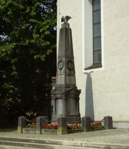 Vor der St. Georgs-Kapelle eine Säule mit Inschrift, Städte und die Namen der Gefallenen des Krieges von 1870/71.