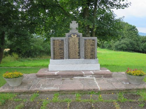 Steinsockel mit drei aneinander gefügten Gedenksteinen, oben ein Deutsches Kreuz