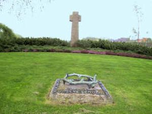 Auf einer leichten Anhöhe im Hintergrund steht ca. 4-5 m hohes Kreuz aus rotem Granit, im Vordergrund ist ein flacher roter Granitquader in den Boden eingelassen worden.