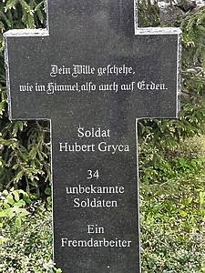 Ein Steinkreuz markiert das Grab eines Fremdarbeiters sowie von 35 deutschen Soldaten, von den nur einer namentlich bekannt ist.