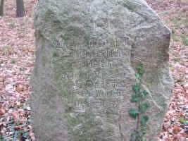 Drumherum sind Wege angelegt, an denen in Abständen kleine Findlinge auf einer kleinen gepflasterten Fläche liegen mit Namen und Geburts- und Sterbedatum.