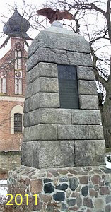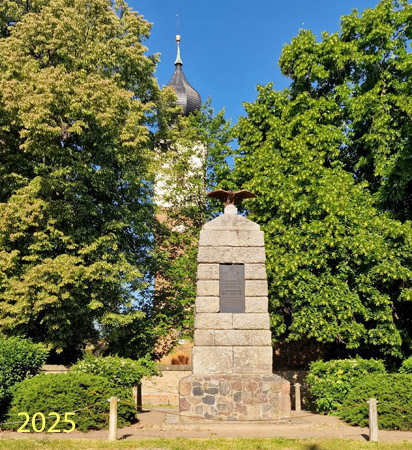 Vor der Kirche: Denkmal aus Granitgestein für die Gefallenen des 1. Weltkriegs, gekrönt von einem Adler.