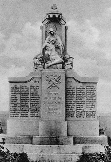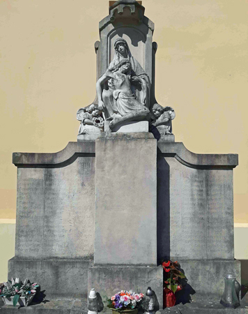 Stele mit Widmung und krönender Pietà-Figur über die ein Baldachin mit krönendem Kreuz ragt.