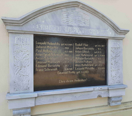 Stein-Gedenktafel für die Gefallenen des 1. Weltkriegs an der Kirchen-Außenwand.
