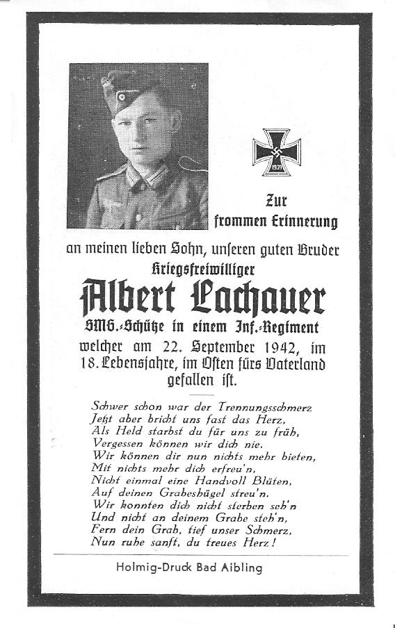 SMG‑Schütze | LACHAUER | Albert | 15.09.1924 Heufeld | 22.09.1942 im Osten, 23.09.1942 H.V.Pl. d. Sankp. 1/7 Iwanowskaja | Inf.Regt. 61, 12.Komp. | verwundet am 22.09.1942 in Podjelki, gestorben, Grab derzeit noch in: Iwanowskaja / Gagarin - Russland |