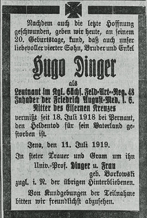 Leutnant | DINGER | Hugo | 18.07.1898 | 18.07.1918 bei Pernant | Kgl.Sächs. FAR 48 | vermisst, Inh. der Friedrich August-Med. i.S. Ritter des Eisernen Kreuzes |