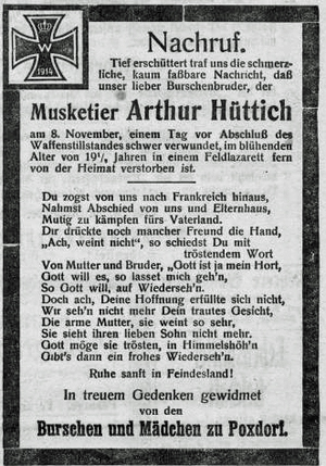 Musketier | HÜTTICH | Arthur | ca. 1898 | 08.11.1918 Feldlazarett | verstorben, 19 ½ Jahre |