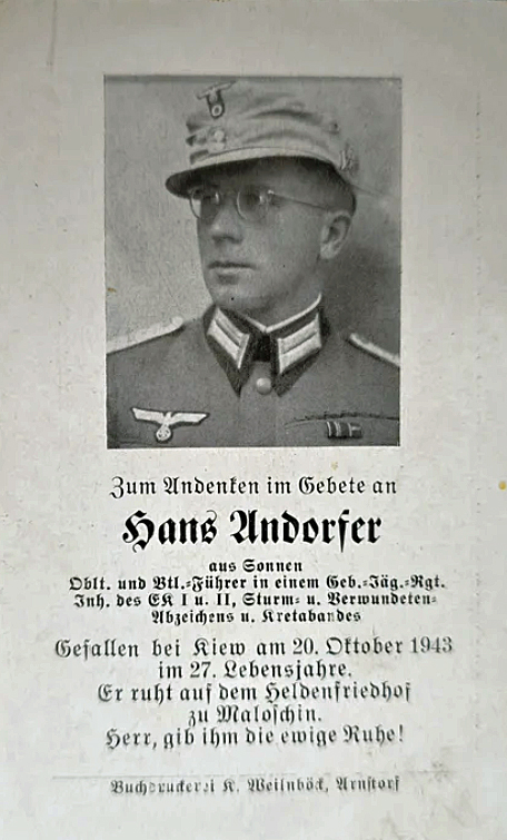 Oberleutnant und Btl.‑Führer | ANDORFER | Hans | 01.02.1917 Sonnen-Wegscheid | 20.10.1943 bei Kiew, Maloshin | Geb.Jäg.Rgt. | begraben in Maloschin, vermutlich als unbekannter Soldat auf die Kriegsgräberstätte Schatkowo überführt |
