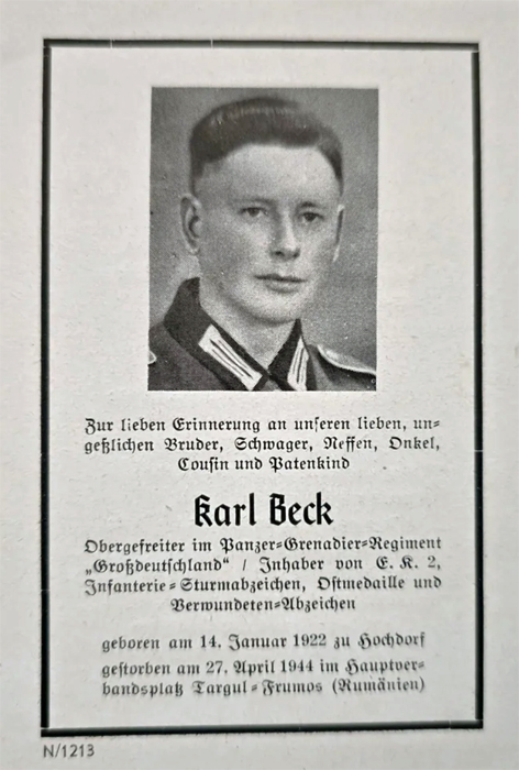 Obergefreiter | BECK | Karl | 14.01.1922 Hochdorf | 27.04.1944 H.V.Pl. Targul‑Frumos | Panzer‑Grenadiert-Regiment | Kriegsgräberstätte in Iasi: Block 3 Reihe 24 Grab 2656 |