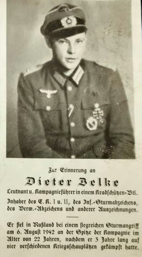 Leutnant und Kompanieführer Oberleutnant | BELKE | Dieter | 10.03.1920 München | 06.08.1942 Bory 20 km südl. Pogorjeloje- Gorodischtsche | Kradschützen‑Btl. | vermutlich als unbekannter Soldat auf die Kriegsgräberstätte Rshew überführt |