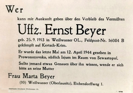Uffz. | BEYER | Ernst | 25.09.1913 Weißwasser (Oberlausitz) | 12.04.1944 Prowonozovska südlich Isjum im Raum von Sewastopol | vermisst; gekämpft auf der Kertsch-Krim |