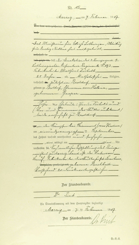 Musketier | DÖRHOLT | Mathias | Brotdorf, Merzig | 21.09.1916 bei Thiaumont, vor Verdun | 9. Lothringisches Infanterie Regiment 173, 2.Komp. | 25 Jahre alt, Fabrikarbeiter, verheiratet |