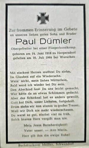 Obergefreiter | DÜMLER | Paulus | 14.06.1918 Herpersdorf | 16.07.1944 bei Warschau, Rela Ostrow | Fliegerhorst Komp. Fliegerhorstkommando E.(v.)275/III. |