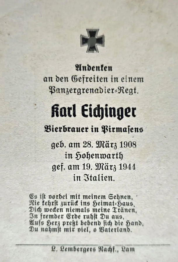Gefreiter | EICHINGER | Karl | 28.03.1908 Hohenwarth | 19.03.1944 Italien | Panzergrenadier‑Regt. | Kriegsgräberstätte in Pomezia: Block G Grab 218 |