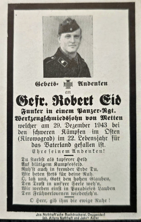 Gefreiter | EID | Robert | 21.03.1922 Metten | 29.12.1943 im Osten, H.V.Pl. Kirowograd | Panzer‑Rgt. | Funker |