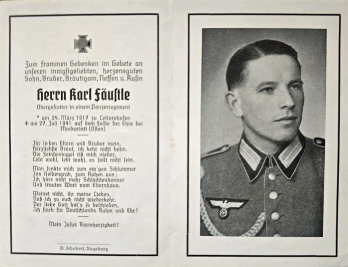 Obergefreiter | FÄUSTLE | Karl | 24.03.1917 Leitershofen | 27.07.1941 bei Markarinti, Makarinki | Panzerregiment, Schützen Regt. 40, 9.Komp. | Grab derzeit noch in: Wjasowka / Demjansk - Russland |