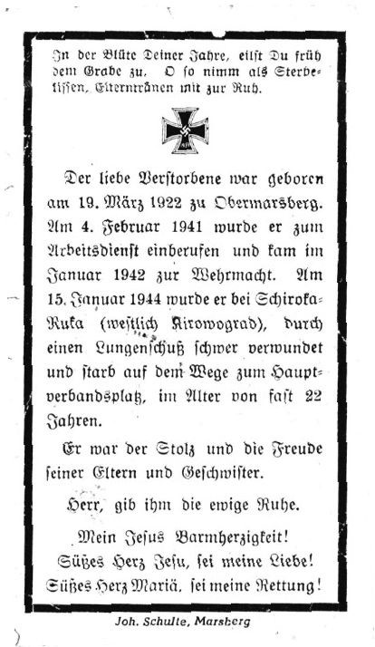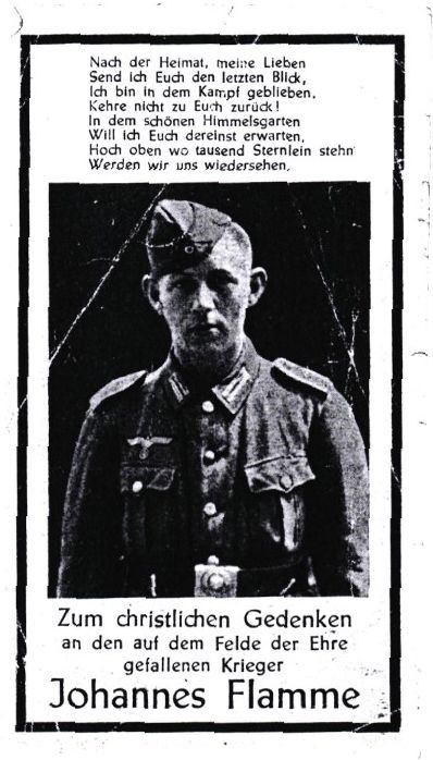 | FLAMME | Johannes | 19.03.1922 Obermarsberg | 15.01.1944 Schiroka‑Ruka w. Kirowograd | Lungenschuß, gest. a.d. Weg zum Hauptverbandsplatz |