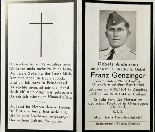 Unteroffizier | GENZINGER | Franz | 09.10.1901 Ampfing | 18.09.1944 Holland | Flak‑Einheit | begraben in Overreppen, Kriegsgräberstätte in Lommel: Block 21 Grab 280 |
