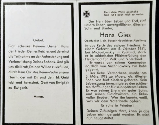 Oberfunker | GIES | Hans | 05.03.1918 Moers | 05.10.1941 3 km nördl. Michailowsky |