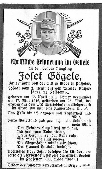 | Soldat | GÖGELE | Josef | 17.04.1896 | 25.05.1916 | Tiroler Kaiserjäger, 21. Feldkomp. | Schwer verwundet 17.05.1916; begraben Militärfriedhof Bielgereuth, Grab 130 |
