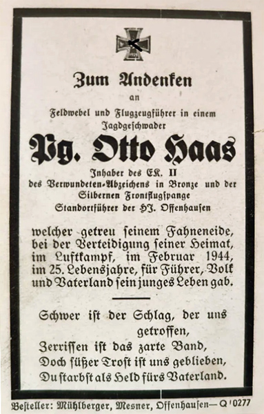 Feldwebel und Flugzeugführer | HAAS | Otto | 30.08.1919 St. Marienkirchen | 23.02.1944 Untergeisbach, Linz | Jagdgeschwader 27, 1.Staffel | Kriegsgräberstätte in Grieskirchen, Familiengrab |